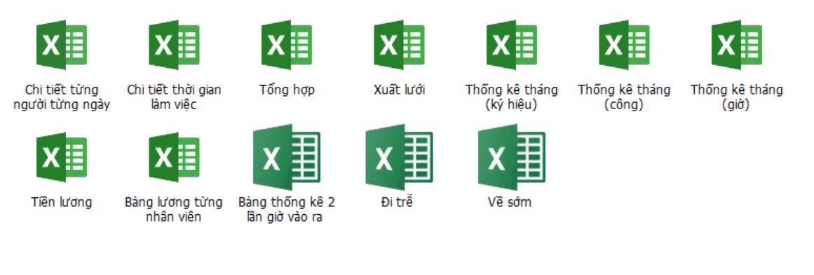 - Xuất tổng hợp: Tổng hợp tất cả công của mọi người trong tháng được báo nhiêu công, tương đương bao nhiêu giờ, tăng ca bao nhiêu phút, đi trễ, về sớm...